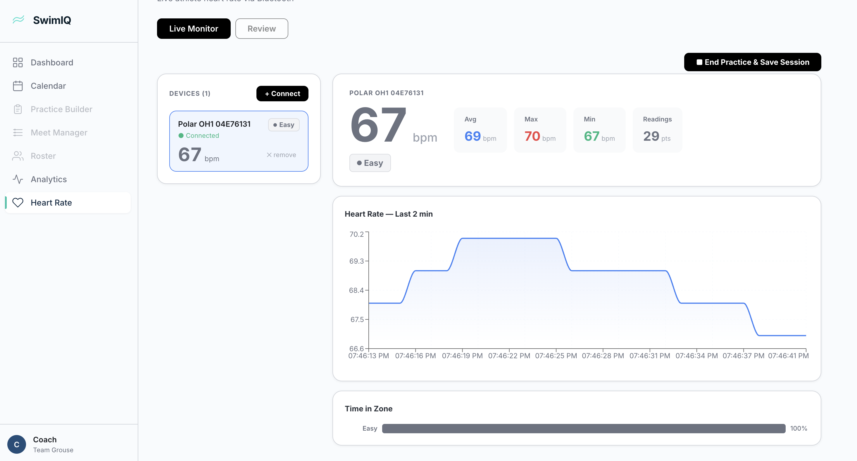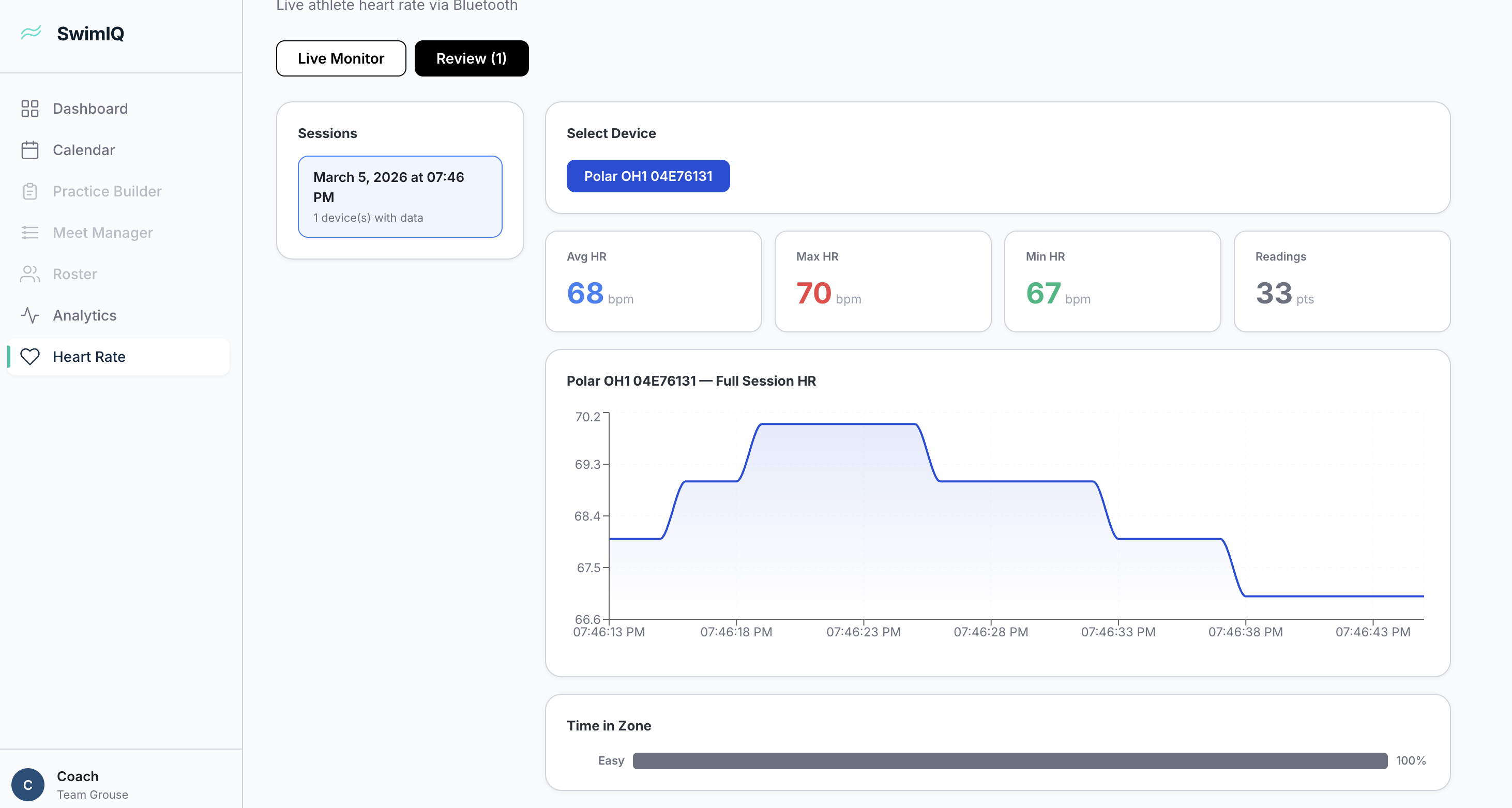 This week we began implementing a heart rate dashboard that will allow coaches to visualize swimmer heart rate data alongside training information. The interface for displaying heart rate trends and zones is now in development, providing the foundation for analyzing effort levels during practices and workouts.